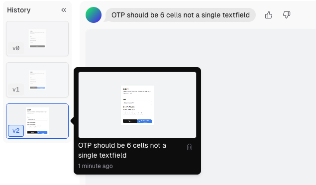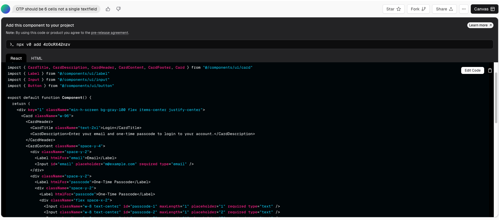 One-Time passcode 는 저렇게 텍스트필드로 입력을 받지 않고 pin code 의 형식으로 받는 경우가 많다. v0 에는 Pick and Edit 이라고 해서 컴포넌트를 선택하고 수정하는 prompt 를 입력할 수 있게 되어 있다. OTP 필드를 선택해서 cell 형식으로 바꿔 달라고 요청해보자.