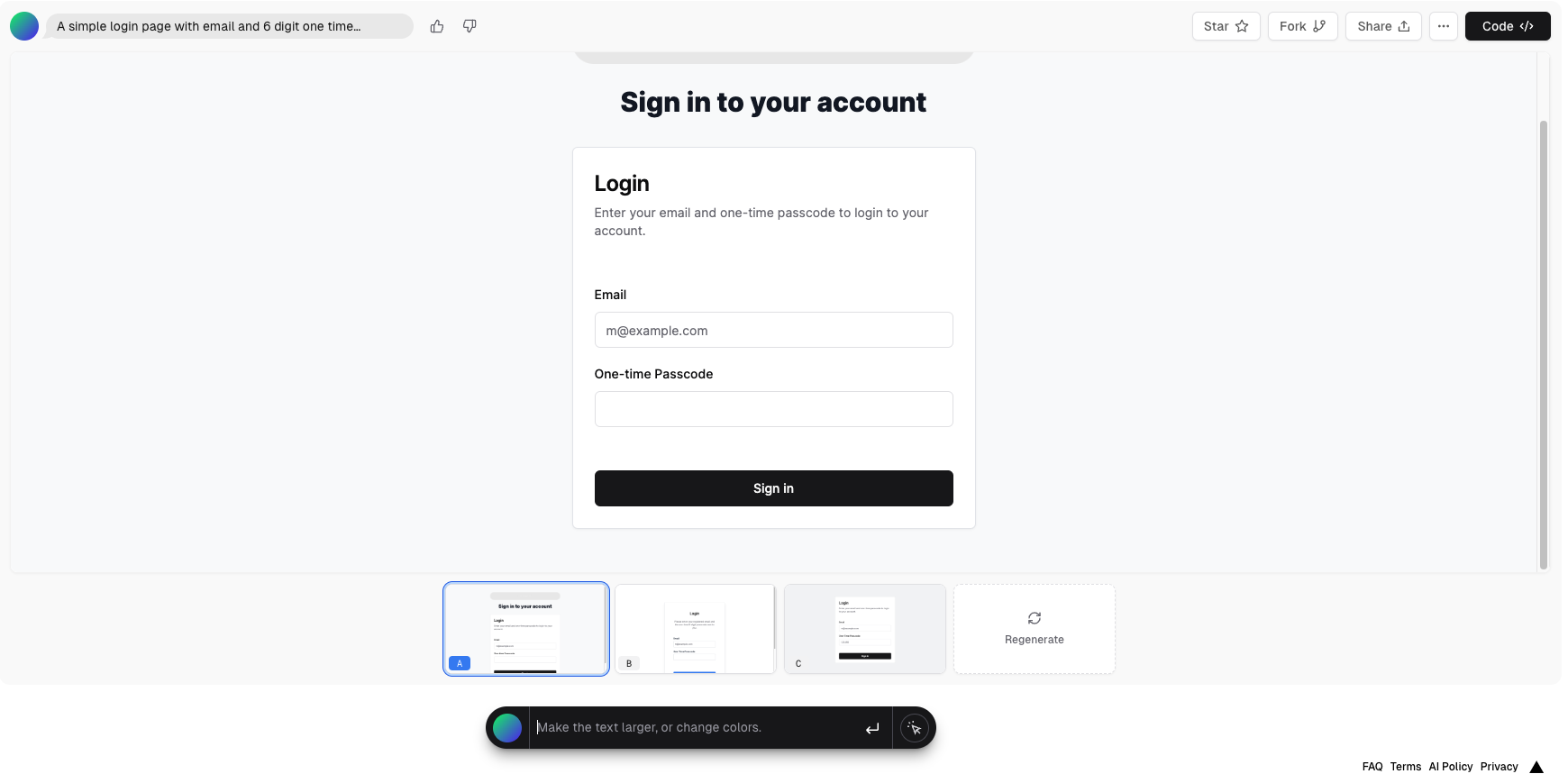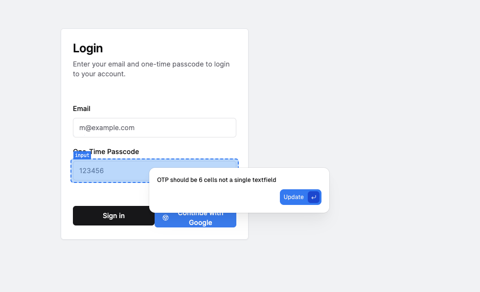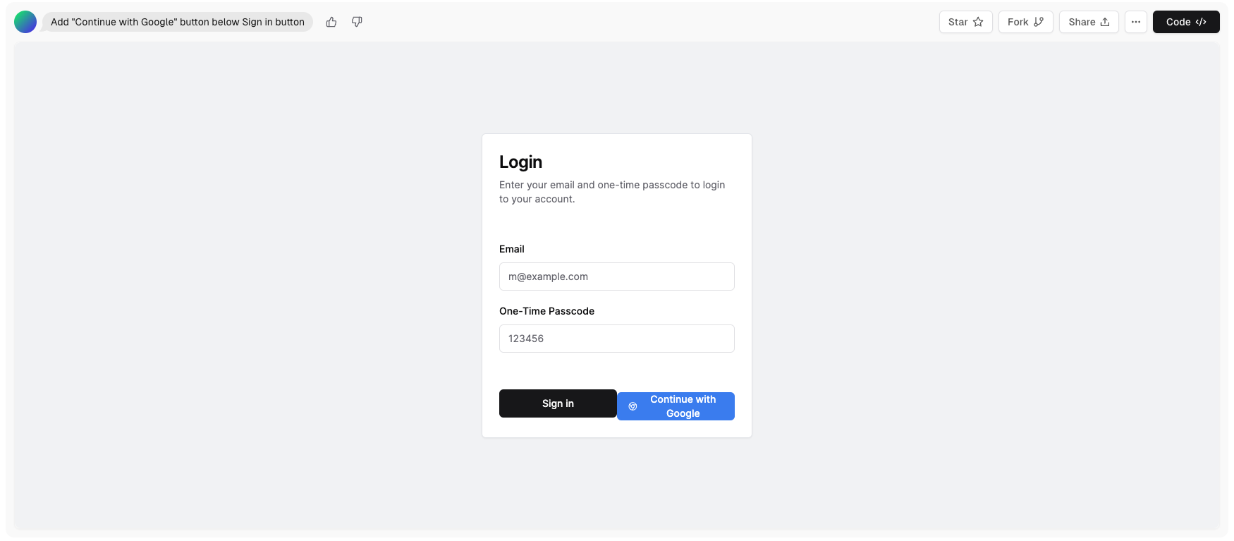 기본적으로 프롬트에 대해 3개의 후보를 생성해준다. 아주 마음에 들지는 않지만, 요구한 대로 이메일을 입력하는 필드와 OTP 입력 필드를 생성하고, 밑에 Sign In 버튼을 생성했다. 생성된 후보 중 한가지를 골라, 추가적으로 prompt 를 입력해서 수정을 할 수 있다. 구글 로그인 기능을 추가하고 싶다고 가정하고, Continue with Google 버튼을 추가해달라고 요청했다.