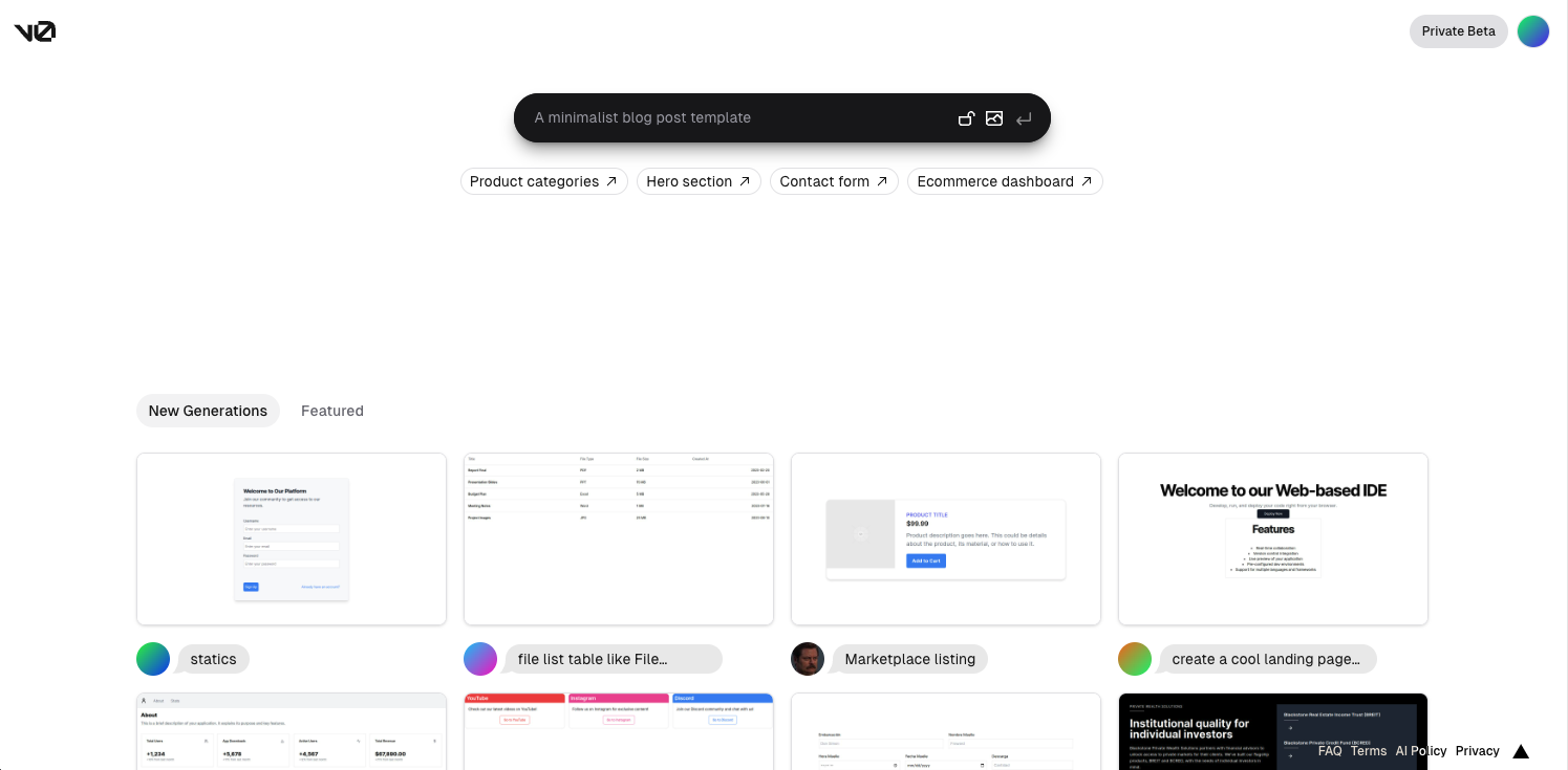 생성형 AI 의 발달로, 프론트엔드의 개발 과정의 많은 부분에 있어서 AI 의 도움을 받게 되었다. 실제로 React 와 같은 프레임워크를 이용해서 웹페이지를 개발할 때는 정형화된 코드를 작성할 때가 많은데, 이런 템플릿 코딩에 있어서는 생성형 AI 가 굉장히 강력한 도구가 될 수 있다. 이러한 트렌드를 증명하듯, Vecel 에서 프론트엔드 개발의 전체 플로우를 진행할 수 있는 AI 인 "v0" 를 발표했다. v0 은 유저로부터 텍스트로 만들고 싶은 웹페이지의 인풋을 받아서 웹 페이지 디자인을 생성해 주는 AI 서비스이고, 해당 디자인을 만들기 위한 코드까지 end to end 로 제공해준다고 한다. 몇 주 전, private beta 로만 제공된다고 해서 신청을 했는데, Beta 접근이 허용되어서 직접 사용해 보았다.