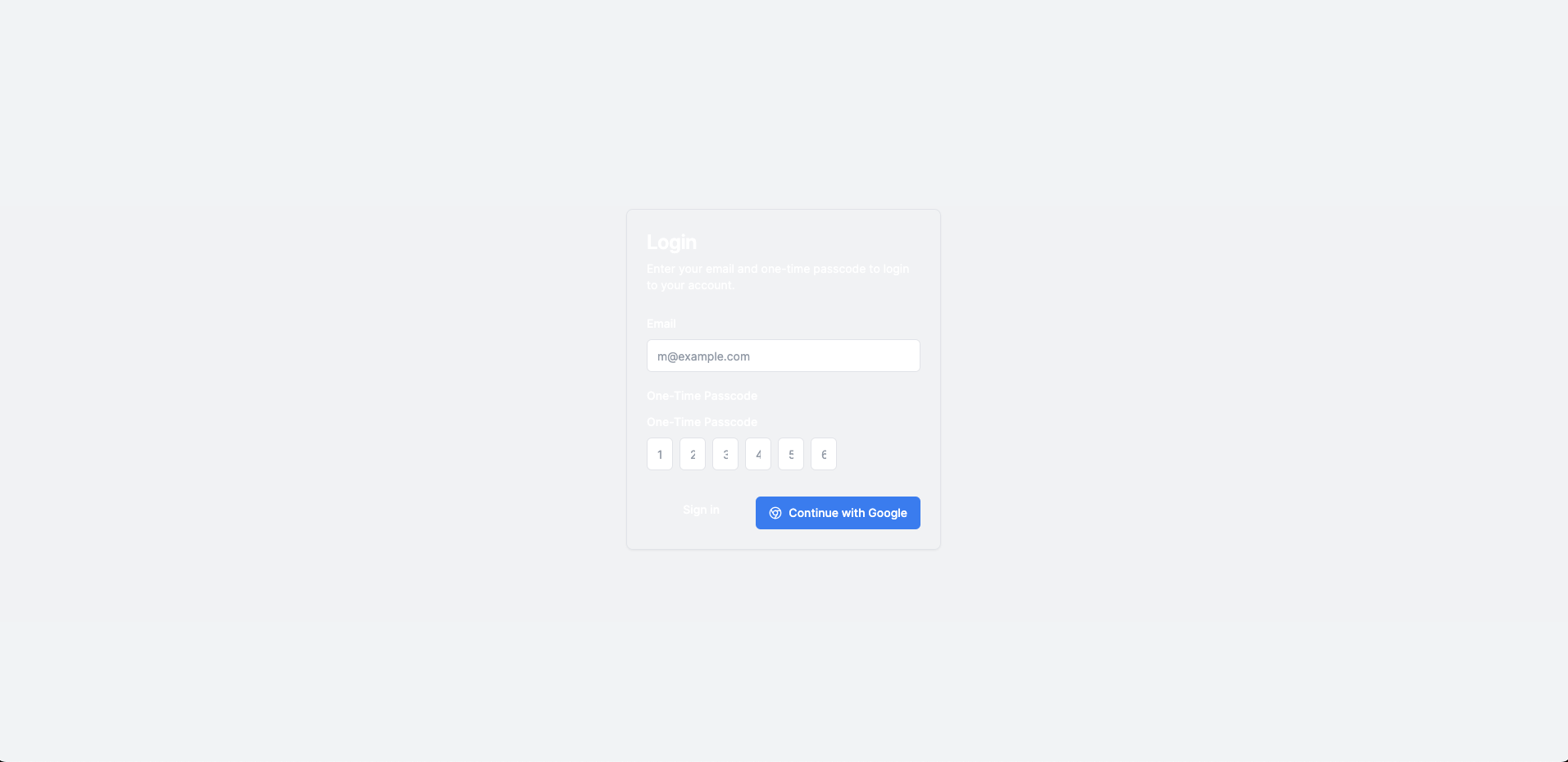 A simple login page with email and 6 digit one time passcode