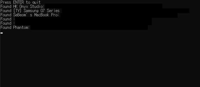 프로그램을 실행하면, 잠시 후 검색된 디바이스와 이름과 Id 가 출력되는 것을 확인할 수 있다.