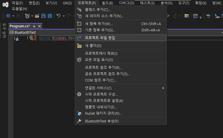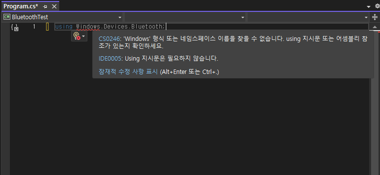 프로젝트가 생성되면 드디어 코드를 작성할 수 있다. 기본적으로 Program.cs 파일이 생성된 것을 확인할 수 있다. 미리 작성되어 있는 코드를 전부 삭제하고, Bluetooth 를 사용하기 위한 코드를 작성해 보자. 위의 문서에서는 Windows.Devices.Bluetooth API 를 사용한다. 해당 네임스페이스를 가져와 보자.