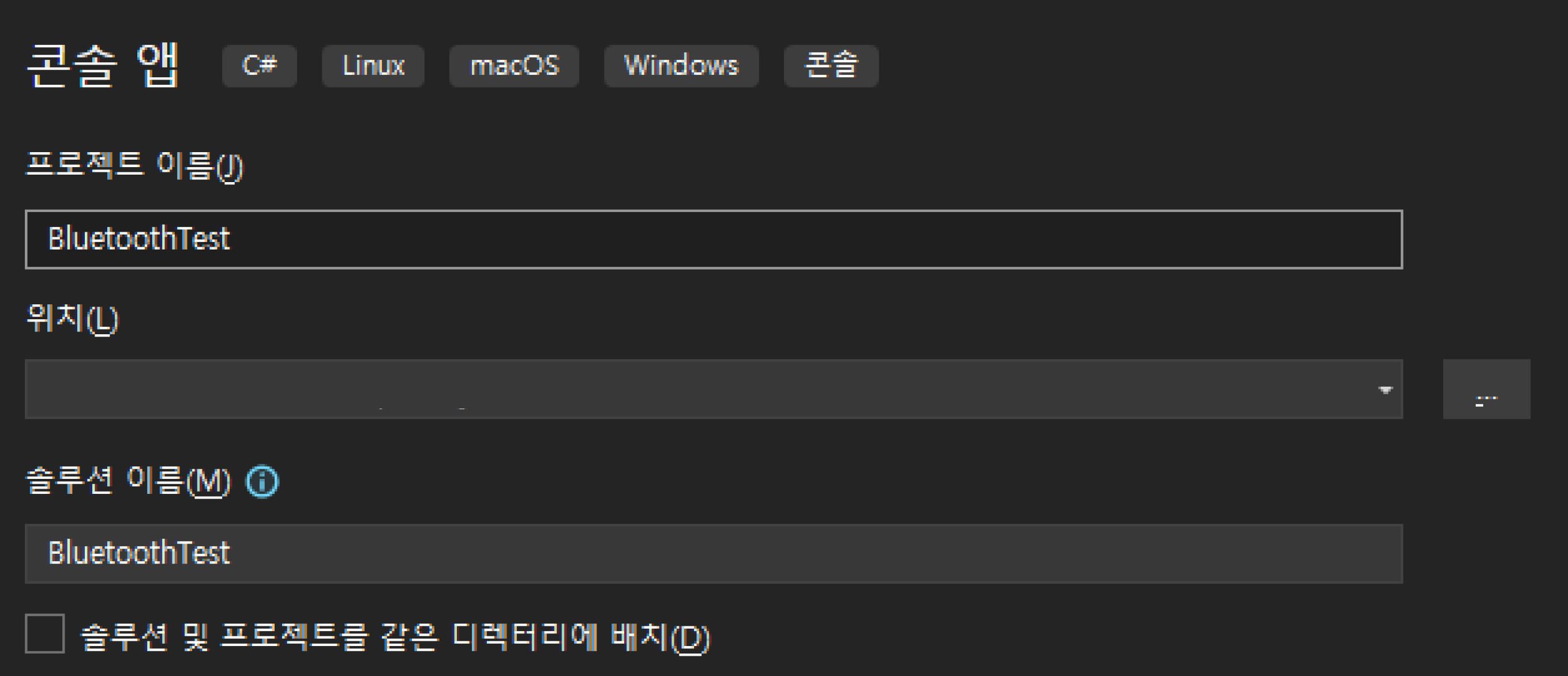 템플릿을 선택하면 프로젝트 이름을 설정할 수 있다. 편의상 BluetoothTest 로 작성하였다.