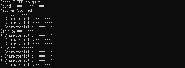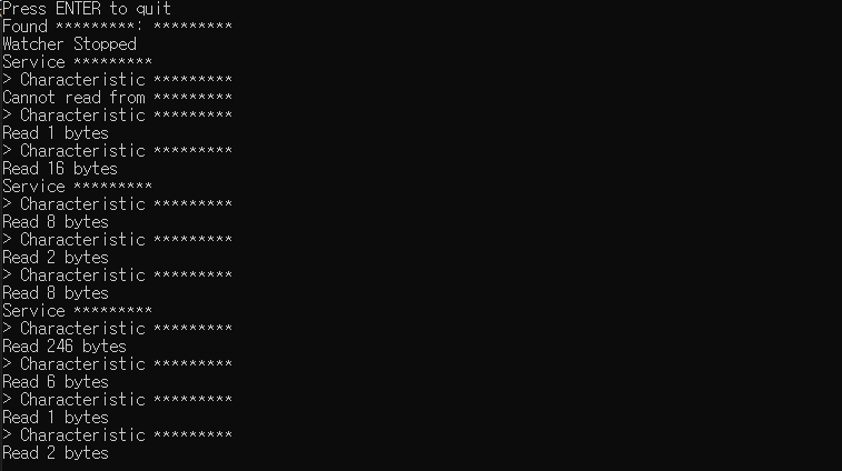 코드를 실행하면, 다음과 같이 첫번째로 검색된 디바이스에 대해 서비스와 특성을 열거한다.