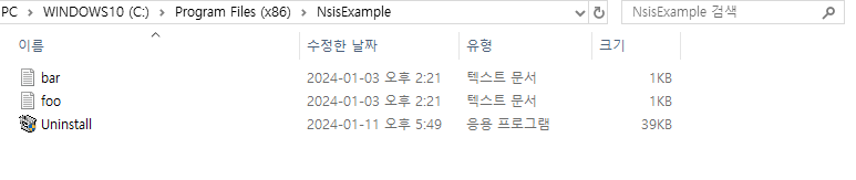 이 섹션은 이름 앞에 "-" 이 붙어 있기 때문에, 선택의 여지 없이 항상 실행되는 항목이다. 먼저 $INSTDIR/Uninstall.exe 라는 이름의 설치 제거 파일을 만들도록 하고, WriteRegStr 을 이용해서 레지스트리 키를 편집한다. 이때, REG_HKLM_UNINST 키를 활용하게 되는데, Microsoft 공식 문서 에서 제공하는 uninstall 레직스트리 키인 "HKEY_LOCAL_MACHINE\Software\Microsoft\Windows\CurrentVersion\Uninstall" 을 사용하게 된다. 이 Section 을 추가하면, 다음과 같이 제어판에도 설치 제거 항목이 표시되고, 설치 경로에도 Uninstall.exe 가 생긴다.