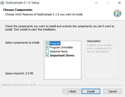 어떠한 설치 항목들을 설치할지 선택하게 할 수 있다. 여기서 설치 항목으로 표시되는 부분은 후에 기술할 Section 이란 항목으로 스크립트에서 정의할 수 있다.