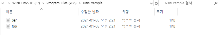 모든 설치가 진행이 완료되고, 설치 경로로 찾아가 보면, 우리가 원했던 대로, 두 텍스트파일이 설치된 것을 확인할 수 있다.