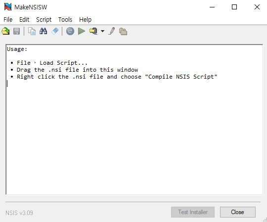 그 다음, 공식 홈페이지 에서 NSIS 를 설치한 후, NSIS 를 실행하면, 다음과 같은 화면이 나온다.