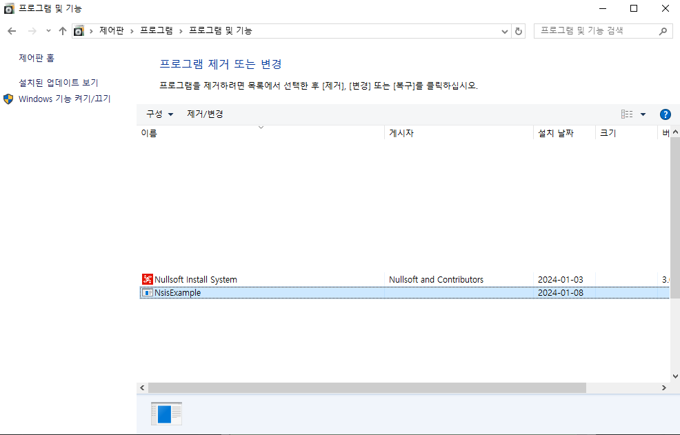 이 섹션은 이름 앞에 "-" 이 붙어 있기 때문에, 선택의 여지 없이 항상 실행되는 항목이다. 먼저 $INSTDIR/Uninstall.exe 라는 이름의 설치 제거 파일을 만들도록 하고, WriteRegStr 을 이용해서 레지스트리 키를 편집한다. 이때, REG_HKLM_UNINST 키를 활용하게 되는데, Microsoft 공식 문서 에서 제공하는 uninstall 레직스트리 키인 "HKEY_LOCAL_MACHINE\Software\Microsoft\Windows\CurrentVersion\Uninstall" 을 사용하게 된다. 이 Section 을 추가하면, 다음과 같이 제어판에도 설치 제거 항목이 표시되고, 설치 경로에도 Uninstall.exe 가 생긴다.