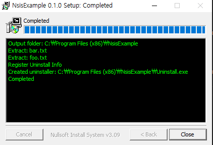 MUI_PAGE_DIRECTORY 에서 설정한 $INSTFILE 을 파일을 작성할 경로로 설정하고, dist 디렉토리 안에 있는 파일들을 해당 위치에 복사하도록 정의했다. 우리는 dist 폴더 안에 foo.txt 와 bar.txt 파일을 넣어 놓았기 때문에, 두 텍스트 파일이 복사될 것이다.