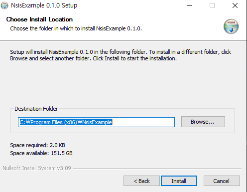 Windows 사용자들에게는 익숙한, 설치 경로 설정 페이지이다. 여기서 설정한 설치 경로는 $INSTDIR 로 레퍼런스 할 수 있다.