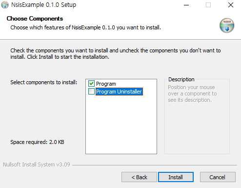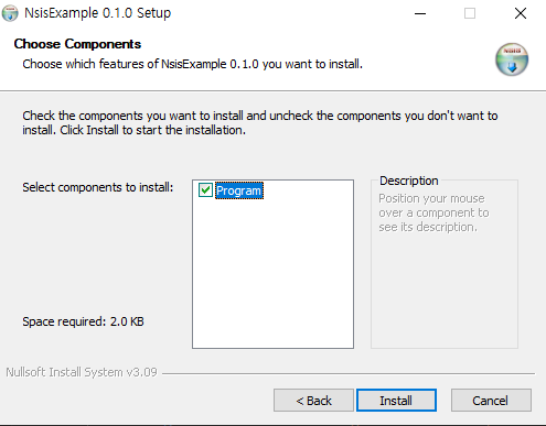 어떠한 설치 항목들을 설치할지 선택하게 할 수 있다. 여기서 설치 항목으로 표시되는 부분은 후에 기술할 Section 이란 항목으로 스크립트에서 정의할 수 있다.