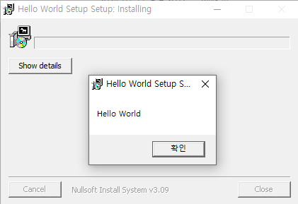 화면 위로 hello.nsi 파일을 드래그 앤 드롭 하면, Hello World Setup.exe 파일이 생기는 것을 확인할 수 있다. 파일을 실행시키면 다음과 같이 설치가 진행된다.