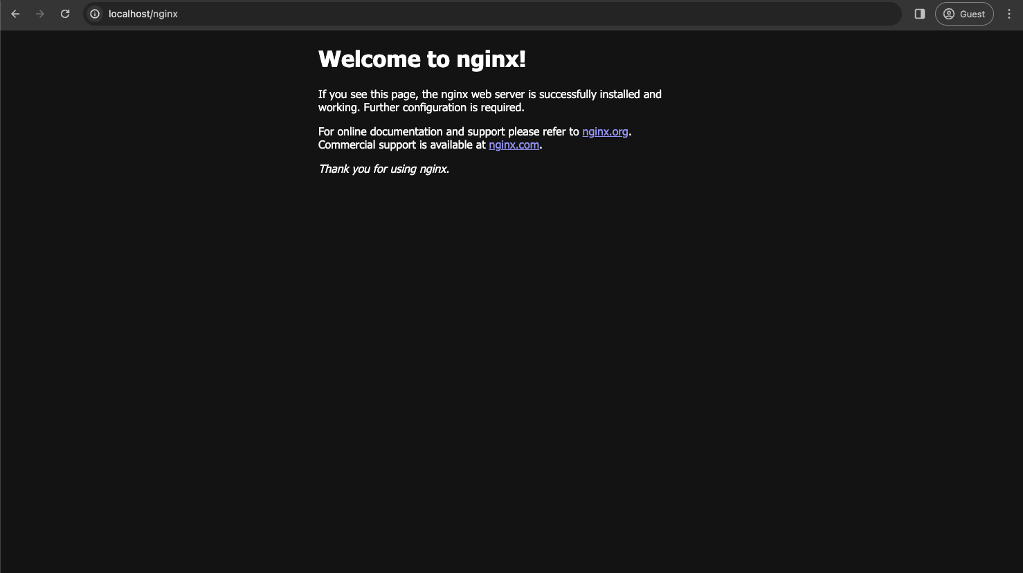 명령어를 실행한 상태로 브라우저에 각각 http://localhost/nginx 와 http://localhost/httpd 를 입력해 보면, 다음과 같이 클러스터 밖에서도 pod 에서 응답을 받을 수 있다.