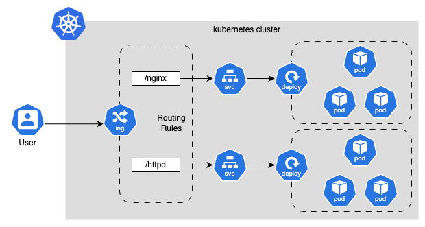 잘 구성된 우리의 클러스터 위에, nginx 와 httpd 서버를 배포해 보자. 실습을 마치면 구성될 아키텍쳐는 다음과 같다.
